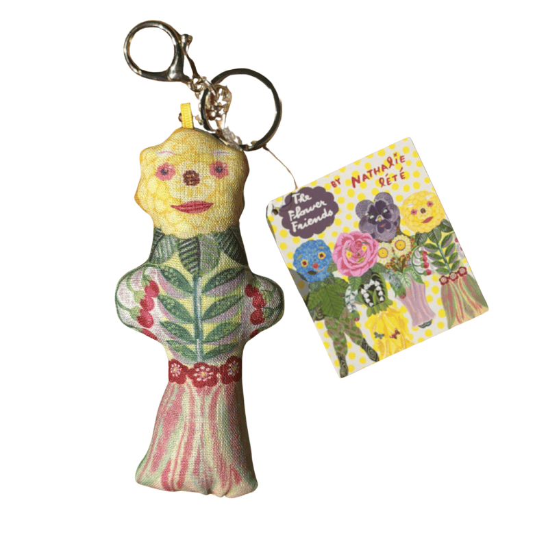 NEW little 5" flower dolls to hang on your bags!! Each doll comes with a brass attachment and key ring, making them easy to clip onto totes, purses, or keys.